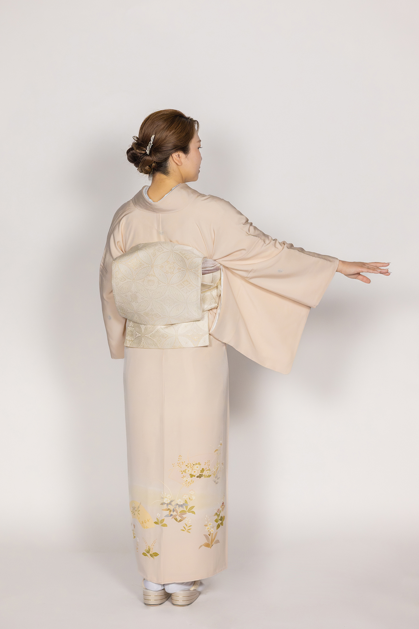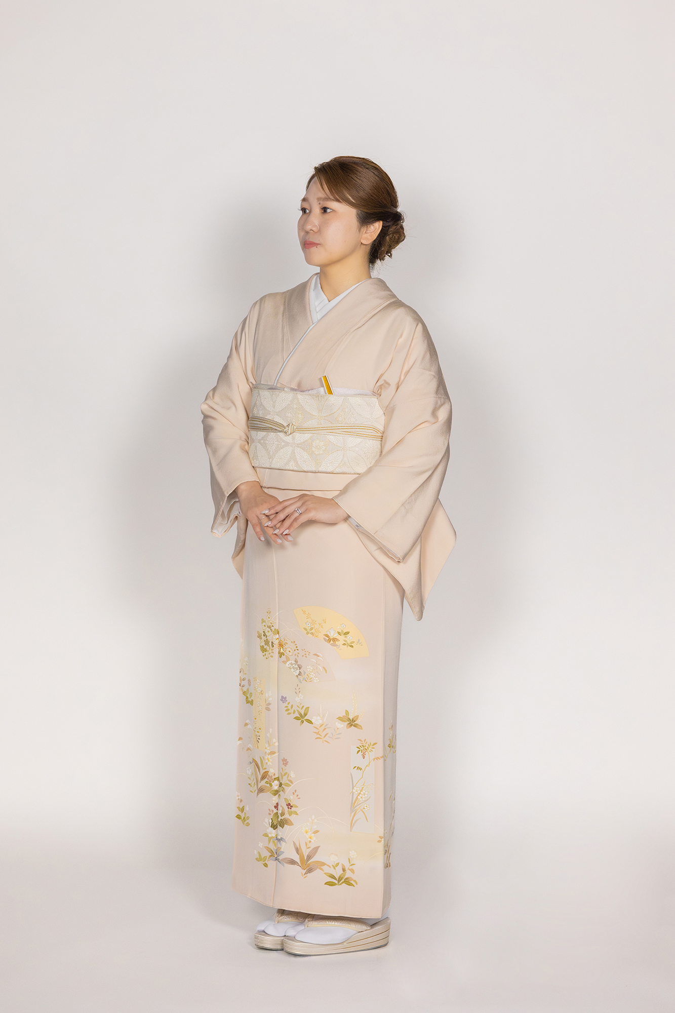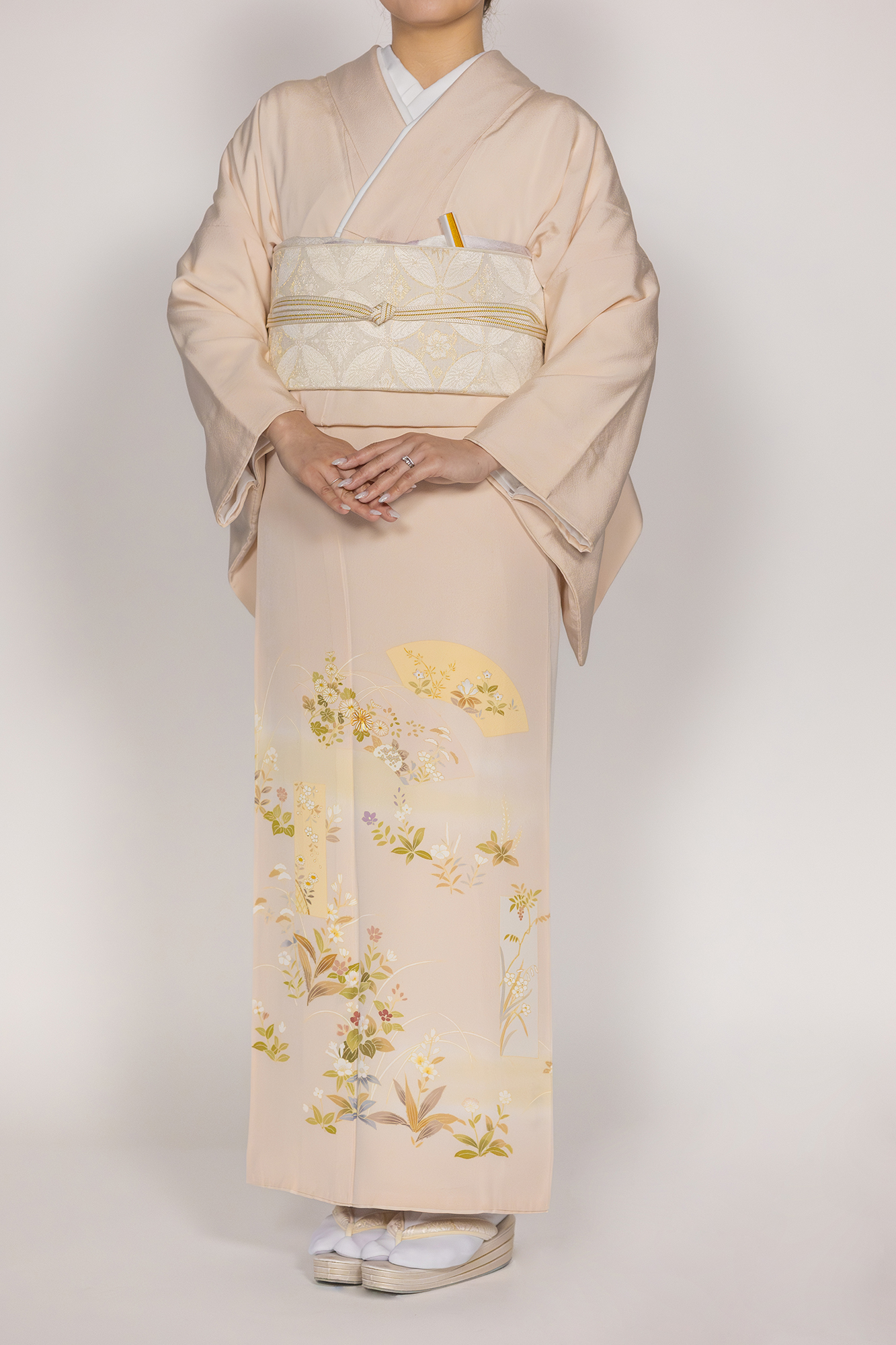 ベージュピンクの地に、四季折々の草花が優雅に広がる色留袖。 柔らかな色彩と繊細な意匠が、格式ある席で上品な華やぎを添えます。 着る人の品格をそっと引き立てる、特別な一着です。